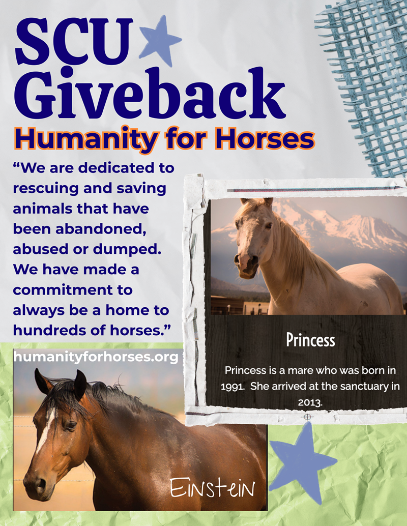 We’ll also continue selling our SCU Giveback stickers for $2 each, including a special horse-themed sticker available throughout the month of March. Every purchase helps support the daily care and nourishment of the horses at Humanity for Horses.